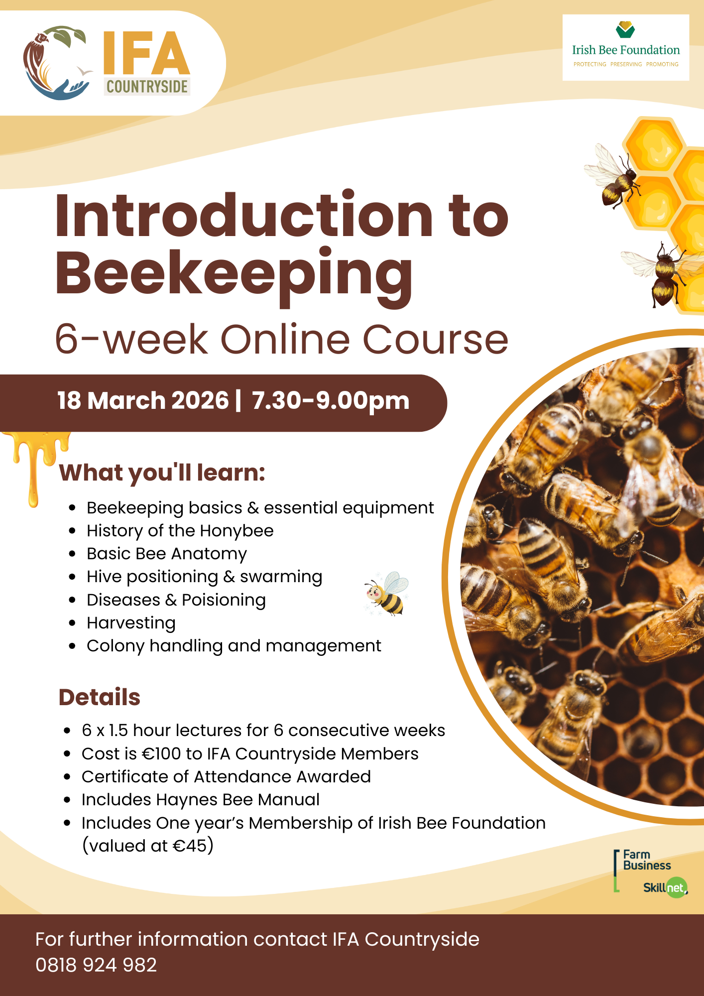 IFA Countryside presents a brand new Introduction to Beekeeping course, delivered by the Irish Bee Foundation. Over six weeks of online sessions, participants will gain comprehensive theoretical insight into the world of honeybees and beekeeping fundamentals.
