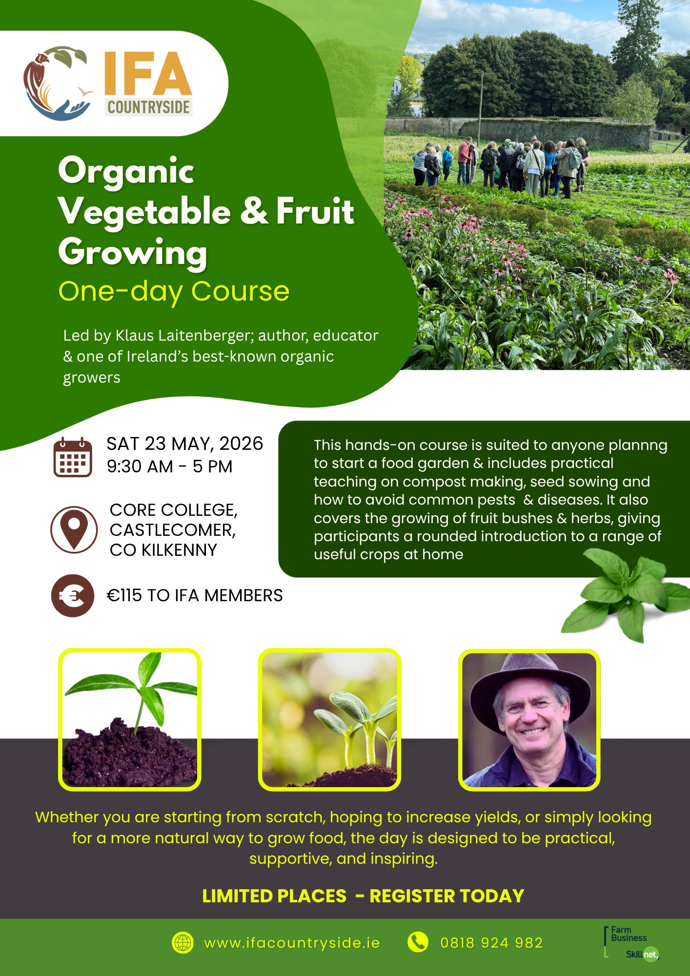 The day combines hands-on garden practice with expert teaching from two experienced organic growers, Klaus Laitenberger and Heiko Klee. Participants will gain practical skills and confidence in growing vegetables and fruit using organic methods that support long-term soil health and productive gardens.
